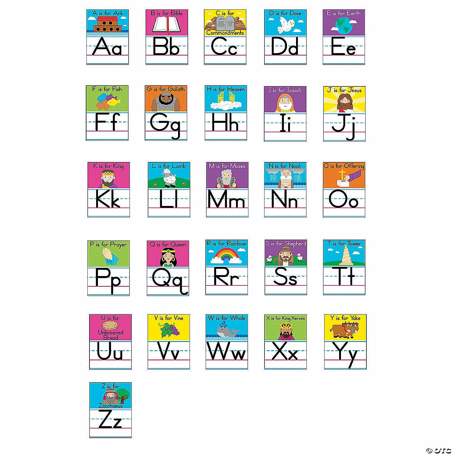 Combine religion and academics in your classroom dรฉcor with this ABCโs of the Bible Classroom Border! Each letter of the alphabet has its own card, which features the letter in upper and lower case, as well as a picture of a faith-based item starting with that letter. Line up this border along a wall in your Sunday School classroom or VBS classroom. Cardstock. (26 pcs. per unit) 8″ x 10 1/2″ ยฉ OTC