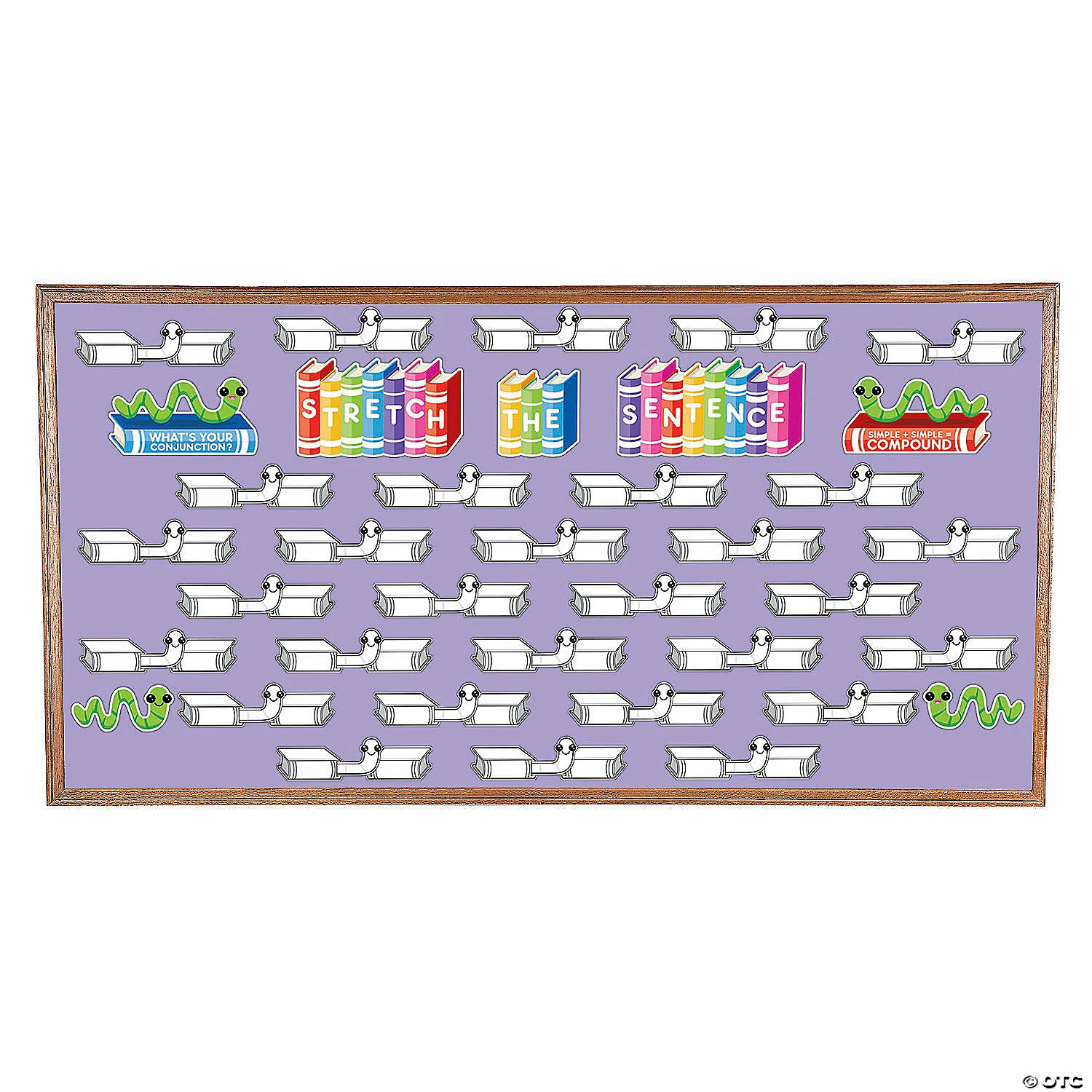 The little worms in this display want to help teach students how to combine simple sentences with conjunctions! A must-have for classroom dรฉcor and language arts curriculum, this bulletin board set features two book cutouts and a smiling worm for each student. Pass out the sets then have students write a sentence on the right and left books as well as the conjunction that works best to combine them on the worm. Display their handiwork as a visual reference of what theyโve learned! Includes 92 cutouts. Makes 30 completed projects. Cardstock. (99 pcs. per set) 3 1/4″ – 6 3/4″ x 8″ – 9″ ยฉ OTCBuild A Board Instructions