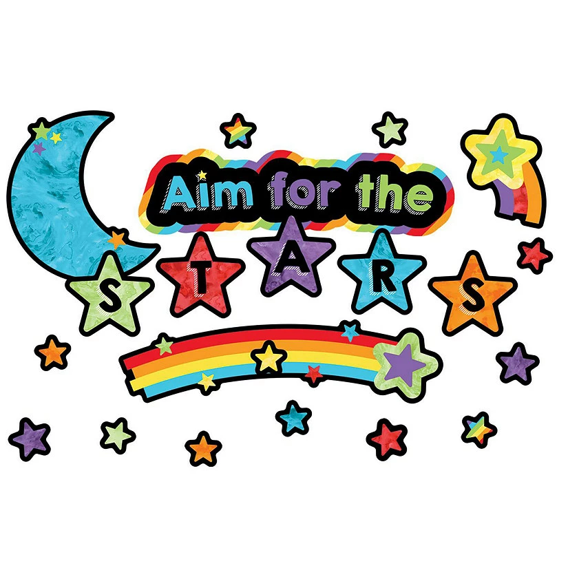 The 48-piece Celebrate Learning Aim for the Stars mini bulletin board display includes these pieces:
