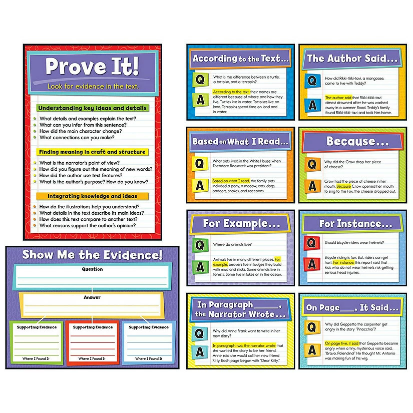 This must-have Evidence-Based Reading and Writing bulletin board set is for all teachers who want to help students improve their reading comprehension and writing skills. Focal words and phrases are emphasized in eight attractive vignettes that show students how to refer to text to answer questions and support their writing. Higher-level thinking is emphasized. Other pieces include a full-size poster and a graphic organizer that can be used to support any unit of study. This set also includes a resource guide with display tips and suggested activities. The Evidence-Based Reading and Writing bulletin board set will teach students the basics of Common Core reading and writing. Students will learn to read closely and to search texts for evidence to support reading comprehension and written work. Higher-level thinking is emphasized.