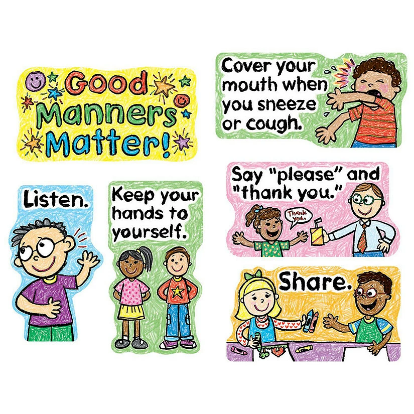 This encouraging, manners-themed bulletin board set is great for reminding students of proper daily etiquette and includes:
