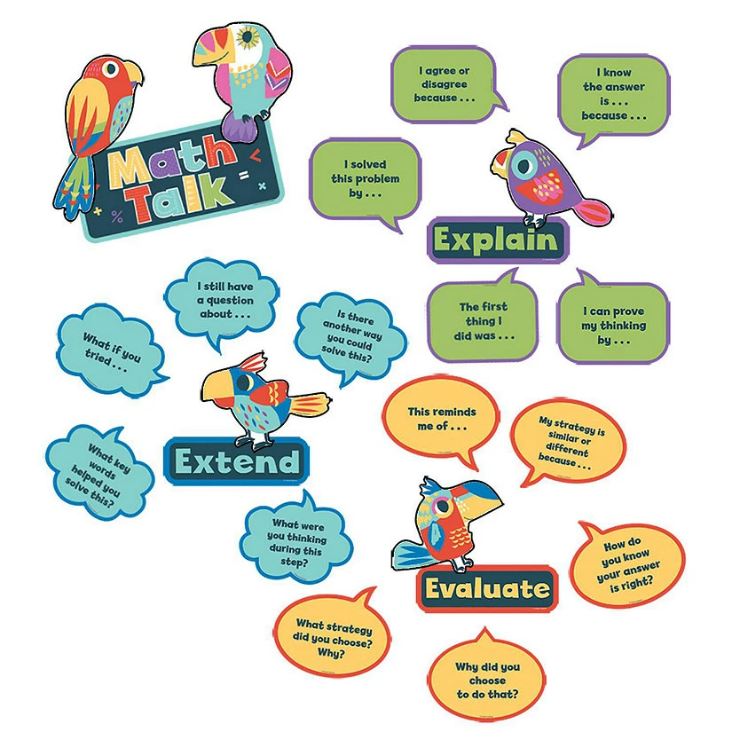 The bright 24-piece Math Talk mini bulletin board set includes these pieces: