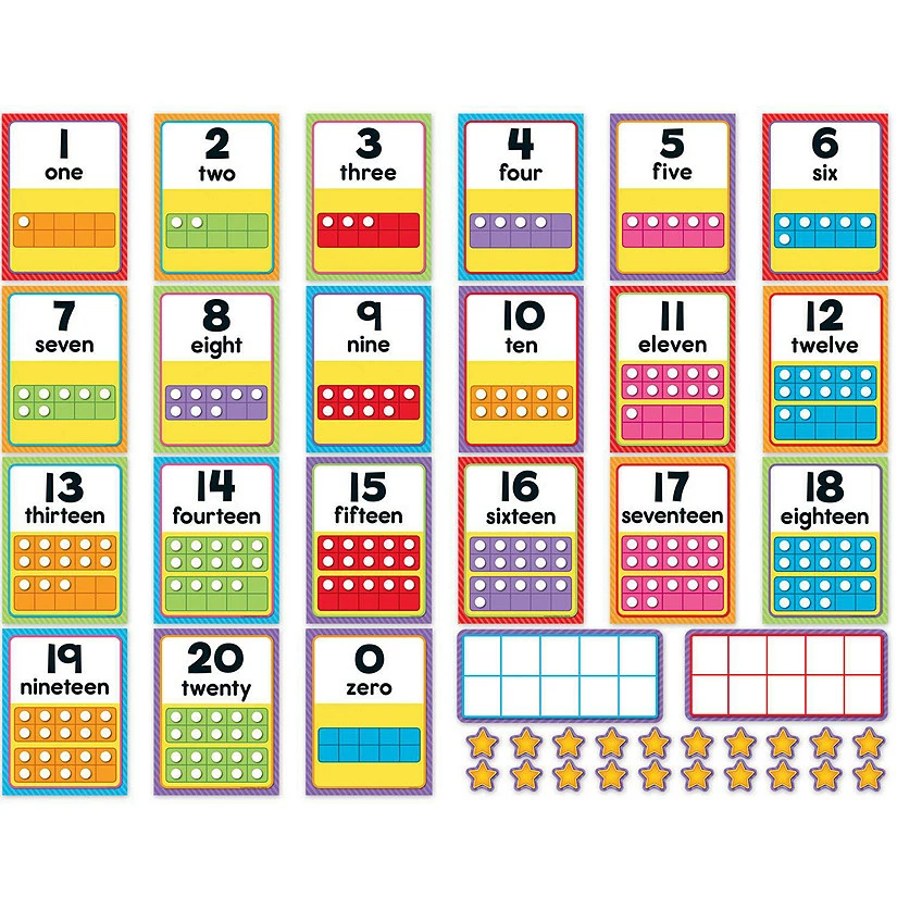 This teaching dรฉcor set displays each number, number word, and ten frame representation on a mini-chart with pieces to explore numbers, counting, and early place value.
