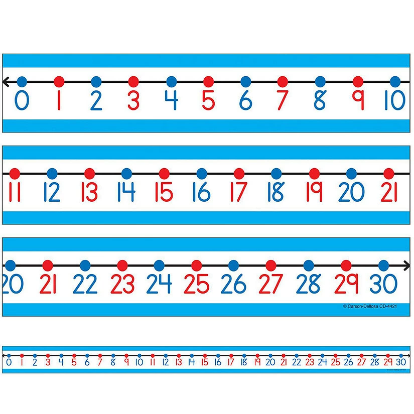 Multi-Purpose Learning Tool: More than just a number line, Carson Dellosaโs Student Number Line Set is the perfect tool for learning and reiterating essential math skills in one personalized label.Dimensions: Each nameplate measures 22 inches x 1 ยฝ inchesโ the perfect size for student desks and easy storage to and from your childโs learning center.Whatโs Included: This set features 30 0-30 color-coded number lines to accommodate an entire classroom and more if needed. A resource guide is also included for engaging math games and activities.Hands-On Learning: Students can practice number recognition, sequencing, counting, and more all in one organized place with a write-on/wipe-away surface for hands-on practice. Color-coded even and odd numbers help students identify numbers with ease.Why Carson Dellosa: For more than 40 years, Carson Dellosa has provided solutions for parents and teachers to help their children get ahead and exceed learning goals. Carson Dellosa supports your childโs educational journey every step of the way.
