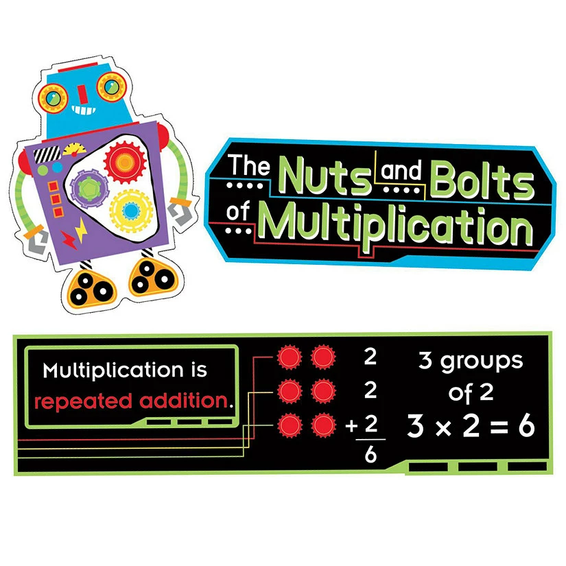 The Nuts and Bolts of Multiplication mini bulletin board set includes these pieces: