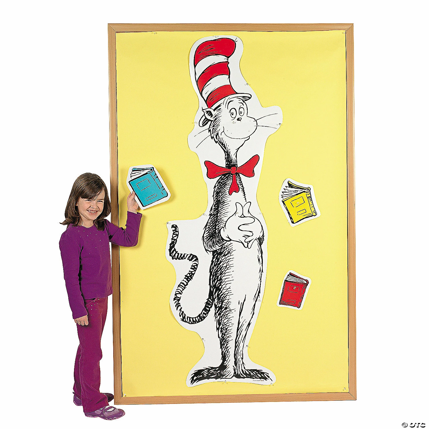 Dr. Seussโข Giant Cat In the Hatโข Bulletin Board Set. Welcome students to the classroom with this fun and colorful Giant Cat in the Hat! Big and bold, this quality card stock Cat in the Hat will greet children with a grin from ear to ear. Set includes four 17″ x 24″ die-cut panels that piece together to create a cat that is over 5-ft. tall and 3 book-shaped cutouts. What a fun way to encourage reading! โข & ยฉ 2007 Dr. Seuss Enterprises, L.P. All Rights Reserved.