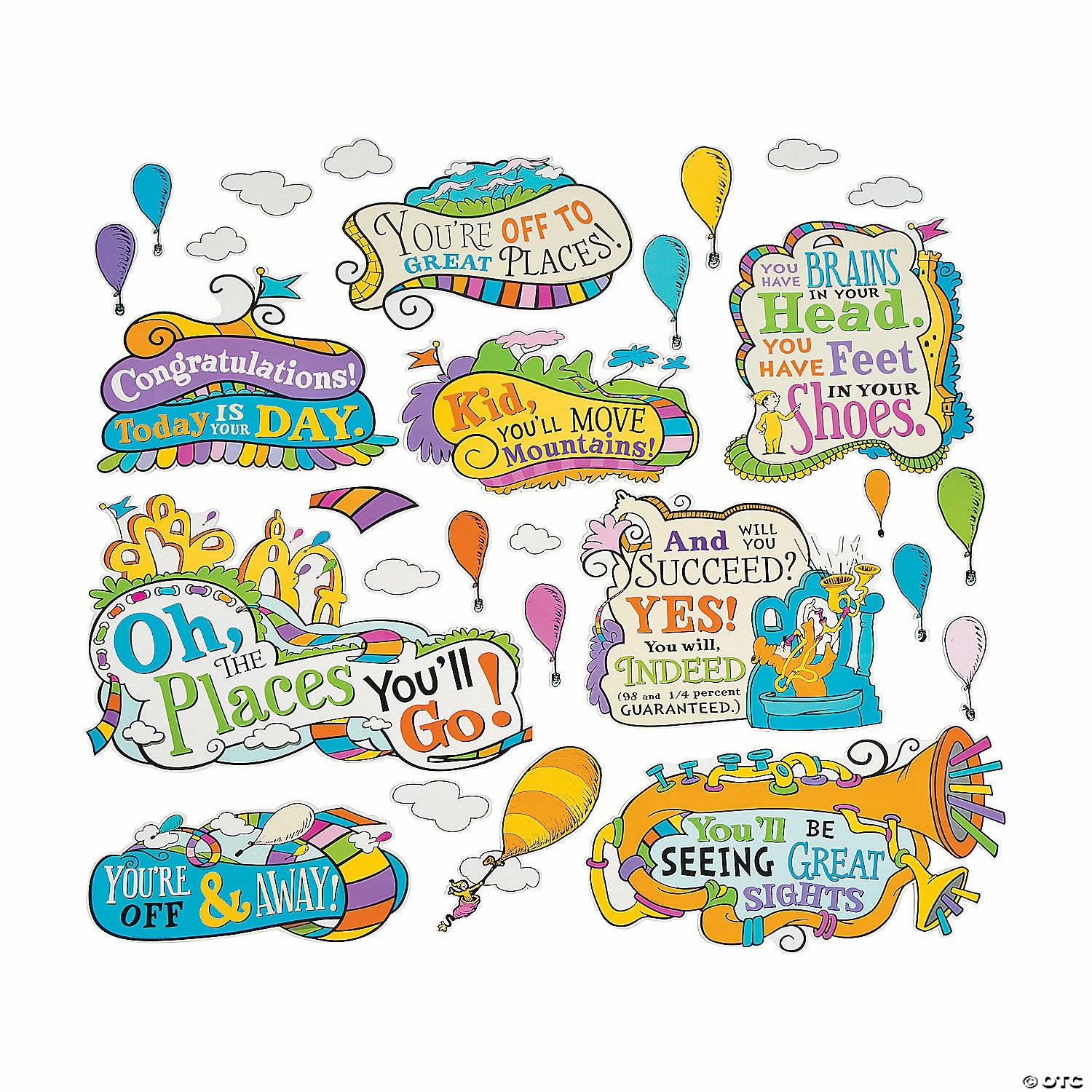 Oh the places and topics your classroom will explore through the school year with the help of this colorful bulletin board set. A great addition to Dr. Seuss™ classroom supplies, these cutouts are sure to add a whimsical touch to any bland, old bulletin board. Dr. Seuss™ makes learning fun and is timely throughout the school year. This set includes 8 quotes, 11 hot air balloons and 8 clouds. Whisk students away to a place where learning is so fun for everyone that they will indeed succeed! Cardstock. (27 pcs. per unit) 2 3/4″ – 23″ x 2″ – 16″ ™/© Dr. Seuss Enterprises, L.P. All Rights Reserved.