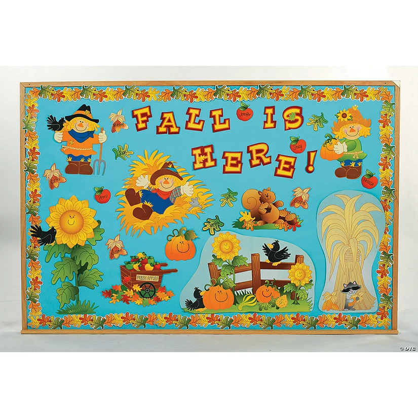 Fall Harvest Bulletin Board Set. Decorate for Fall fun with these cardboard bulletin board decorations! Ideal for classroom use, you can add your own Fall photos to these cutout pieces for a fun display. Includes corn, leaves, scarecrows, a haystack, fence and more. (150 pcs. per unit) Approx. 4″ x 4″ – 26″ x 16″. ยฉ OTC