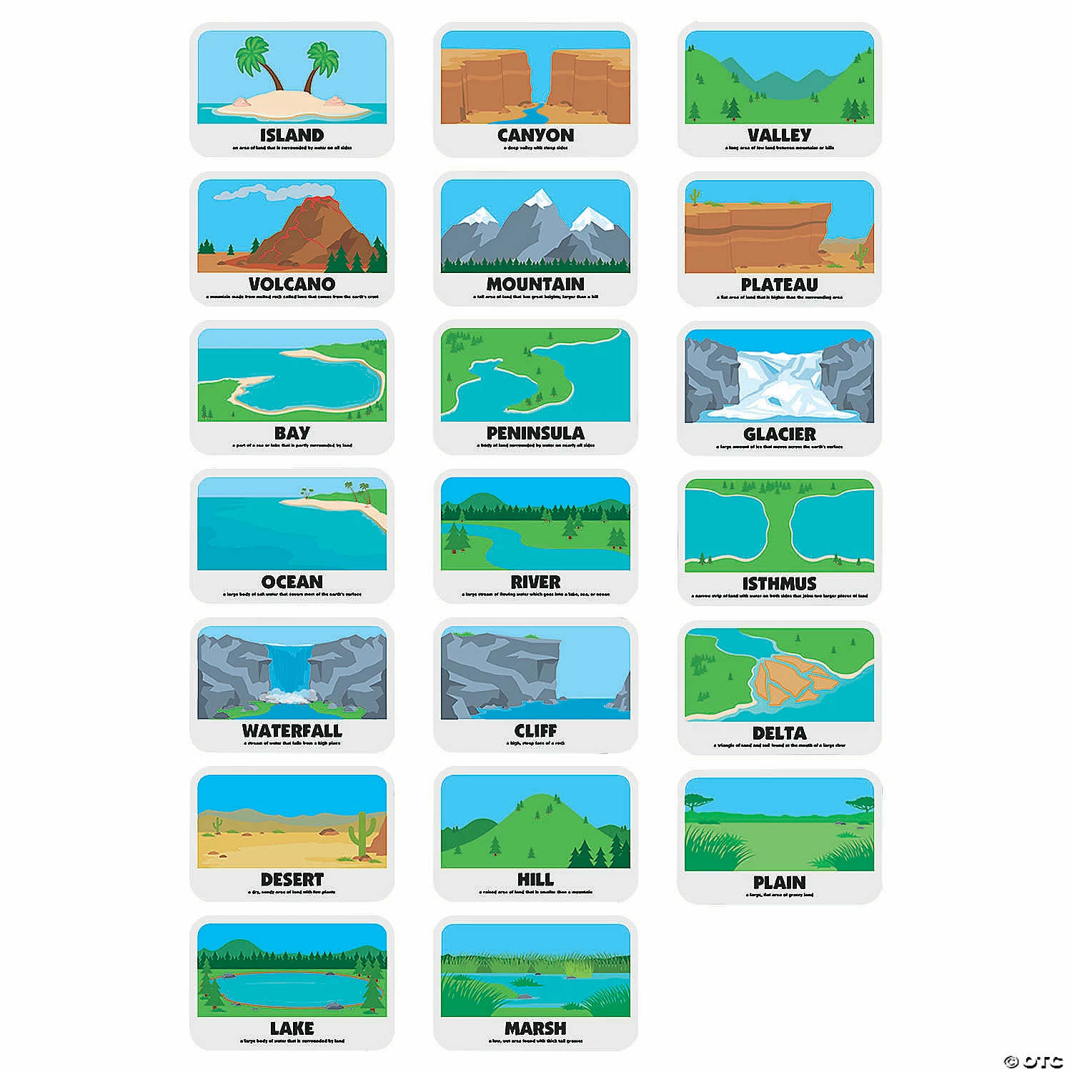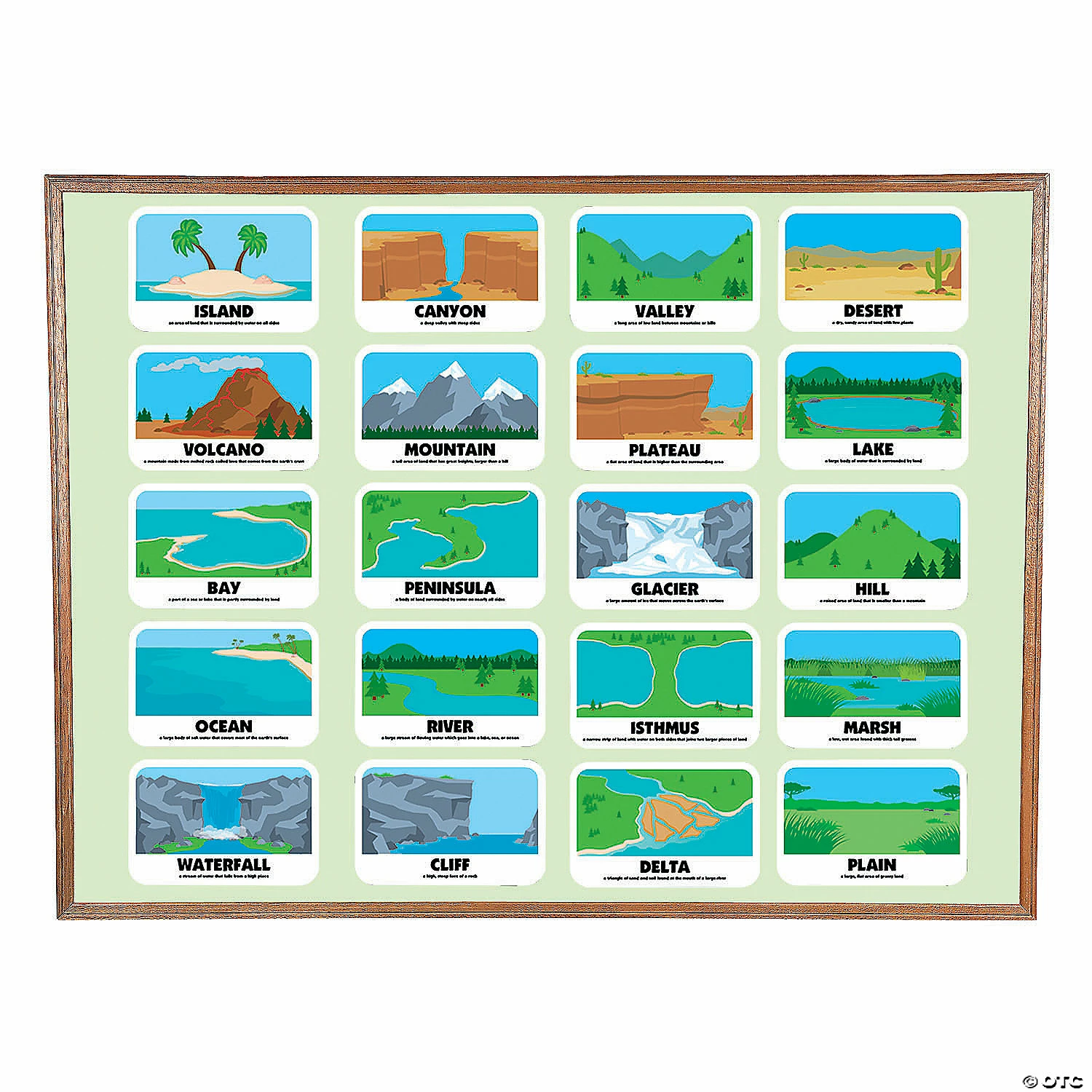 Make it easier for students to pick up the differences among 20 different landforms with this colorful bulletin board set! Priced to thrill and built to last, this classroom decoration set features images of the different landforms, from a marsh to a volcano and everything in between, along with the name and a short description. Add this set to your science center supplies. Cardstock. (20 pcs. per unit) 12 1/2″ x 8 1/2″ ยฉย OTC