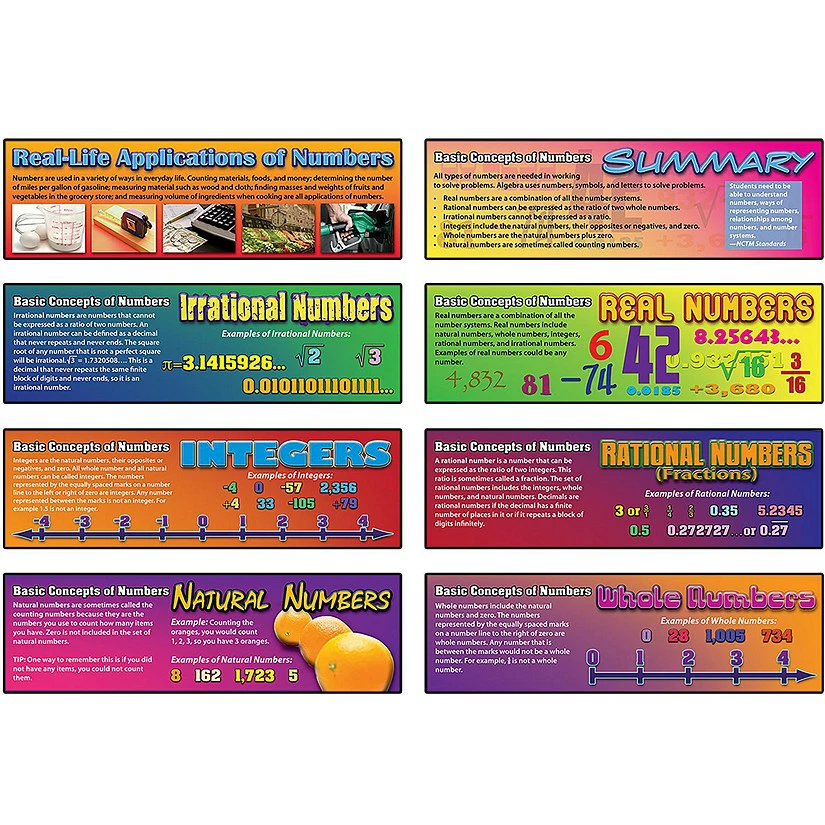 *8 strips (21″ x 6″ each) which focus on natural, whole, rational, and irrational numbers, integers, and real numbers