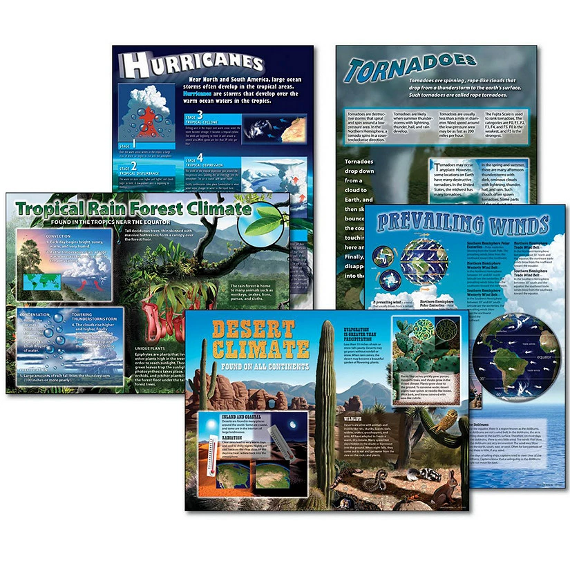 *5 charts (17โ x 24โ each) with realistic artwork and facts about deserts, tropical rain forests, hurricanes, prevailing winds, and tornadoes