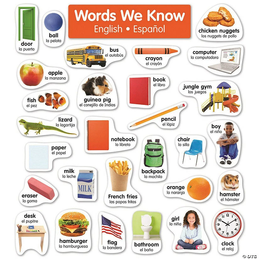 Immerse students in a foreign language with this bilingual resource for early learners. Features 42 photo cards of common school items with English and Spanish labels. Perfect for ESL, ELL, and dual-language classrooms.Each set includes 43 pieces: Words We Know banner (21″ x 5.75″), 42 photo cards with English and panish labels, Teaching guide. Special Shipping Information: This item ships separately from other items in your order. This item cannot ship to a P.O. Box. This item may be subject to additional processing days. ITEM IS NOT ELIGIBLE FOR EXPEDITED SHIPPING