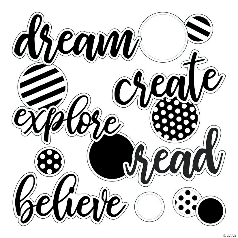 Add inspirational messages to your bulletin boards or throughout your classroom with this mini bulletin board set. Includes 5 small dots, 8 large dots and 8 word cutouts that include: explore, dream, create and read. These cutouts include a black and white design with polka dots and stripes that will add a special touch to any classroom decorations. Cardstock. (21 pcs. per set) 3″ – 13″ ยฉ Carson-Dellosa Publishing.